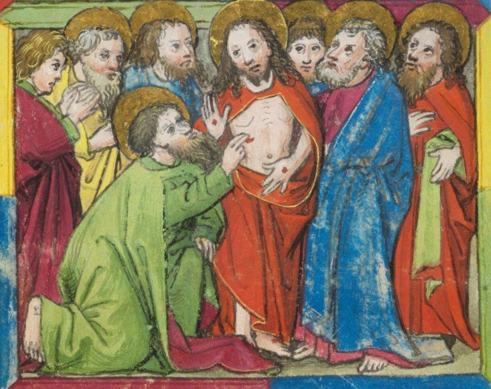 Eerst zien … Toch durven we ook wel eens twijfelen zoals Thomas. We willen liever eerst zien en dan pas geloven. Thomas staat zo wat als beeld van ons allen als christen: het ene moment zijn we bereid om Jezus tot in de dood te volgen en op andere momenten twijfelen we sterk. Thomas raakt er niet uit op eigen krachten, zoals niemand van ons. Als we als mensen gekwetst worden geraken we er niet alleen uit. Maar Jezus is en blijft altijd de initiatiefnemer. Hij komt naar de leerlingen en wenst hen zijn vrede toe. Thomas verandert en gaat geloven als hij Jezus mag aanraken. Daarom zegt Jezus ons: leg uw handen maar op de gevoelige, zere plekken van de samenleving van vandaag. Dan worden deze plaatsen, net als Jezus’ handen, geen zwakke plaatsen maar de sterke tekenen van de kracht van de liefde.