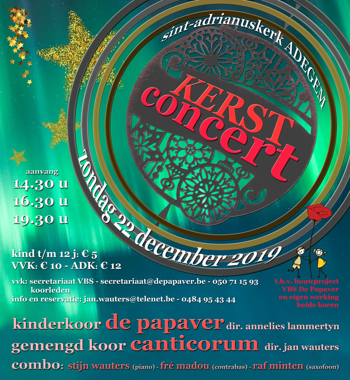 Het 'Gemengd Koor Canticorum' o.l.v. Jan Wauters en het kinderkoor 'De Papaver' o.l.v. Annelies Lammertyn organiseren op zondag 22 december 2019 niet minder dan drie kerstconcerten in de kerk van Adegem.