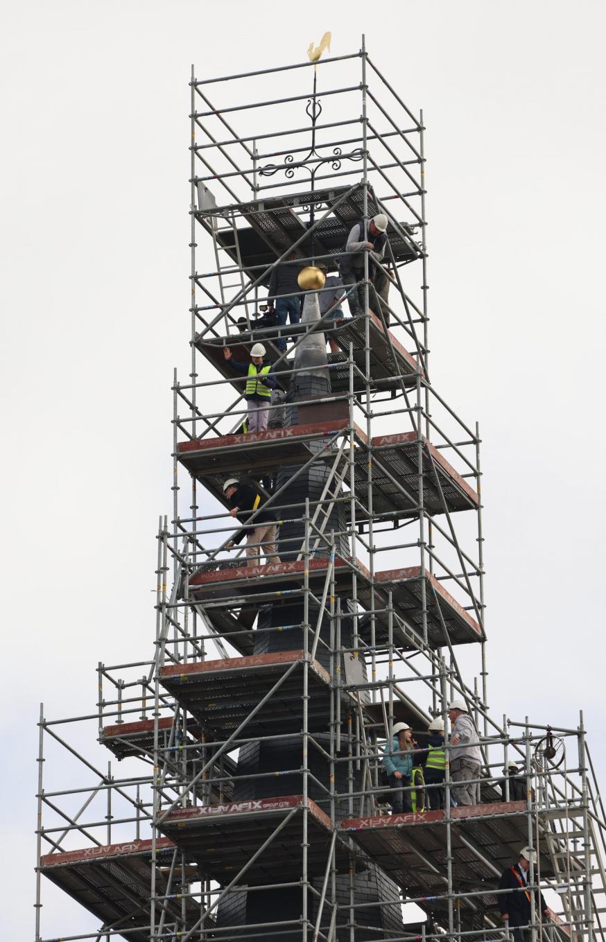 Daarna plaatst de aannemer, samen met enkele leerlingen, de bol en de windhaan opnieuw op de toren.