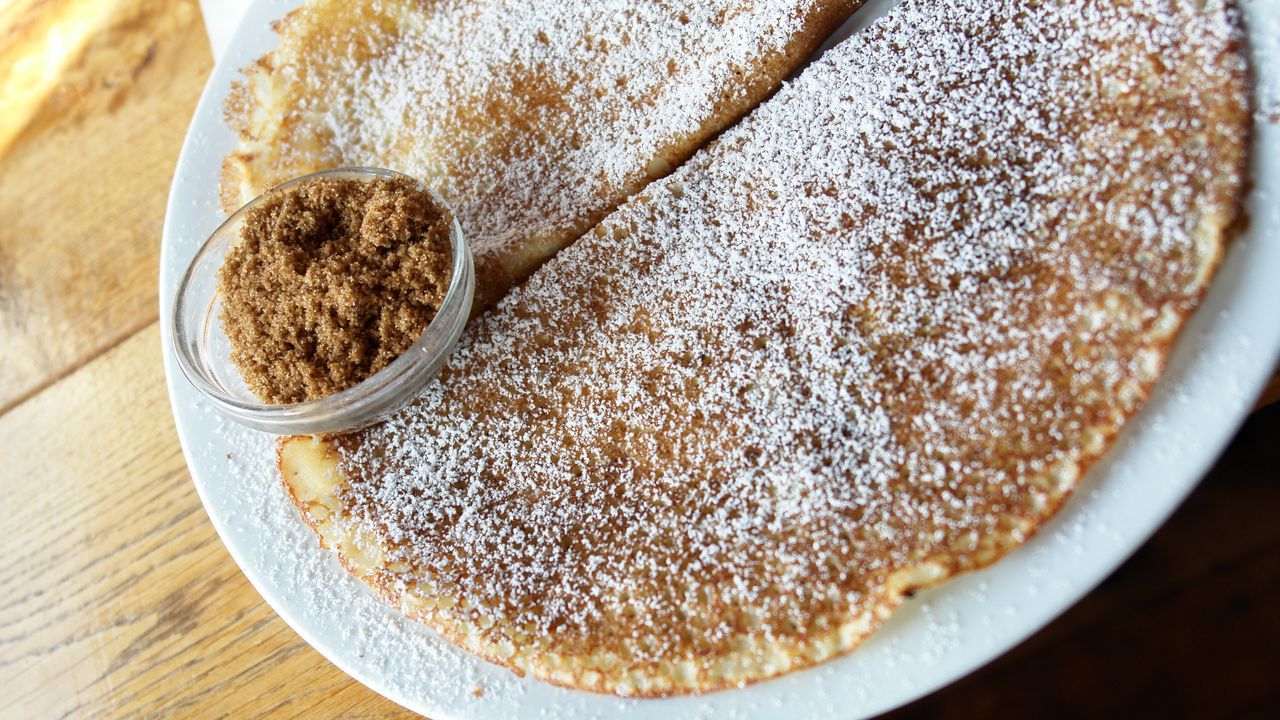✗ Doe een pollepel beslag in de pan en bak tot deze bijna droog is vanboven.