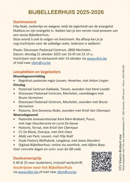 Inschrijven voor het Bijbelleerhuis kan via Bijbelleerhuis 2025-2026 | Kerknet of mail naar vlbm@ccv.be