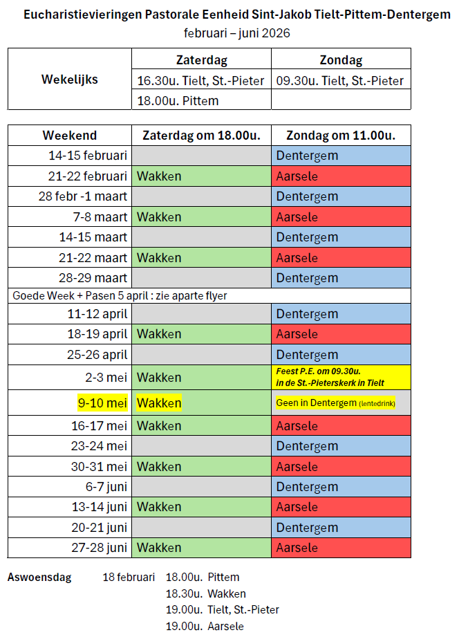 St.-Pieterskerk Tielt:Op dinsdag-, woensdag- en vrijdagmorgen om 08.15u. in de sacristie (ingang via de zijkant aan zaaltje Tolentijn)Op donderdagmorgen om 09.00u.
