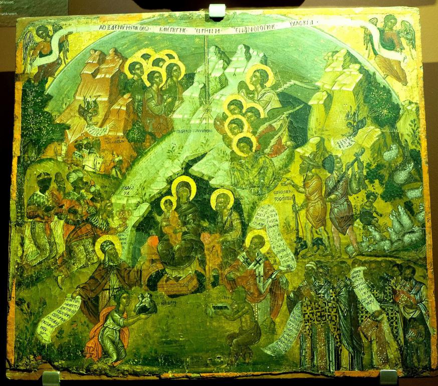 De icoon stelt Jezus voor in de stal, omgeven door engelen, evangelisten, profeten en heiligen uit het Oude Testament, Maria en Jozef, de herders met hun kudde en een massa mensen uit alle volken en tijden, die zijn boodschap hadden gehoord en ernaar geleefd hebben. De toon van de icoon is kleurrijk, vreugdevol en feestelijk! En wij staan midden in deze mensenstroom en geven op onze beurt de droom door.