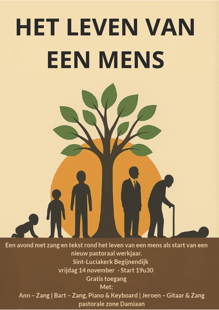 De zonale overleggroep (ZOG) biedt als start van het pastoraal werkjaar een avond aan met zang, beeld en tekst rond ‘Het leven van een mens’. Het is een expliciete uitnodiging om elkaar te treffen, te inspireren en te bemoedigen op vrijdag 14 november om 19.30 uur in de St.-Luciakerk van Begijnendijk.